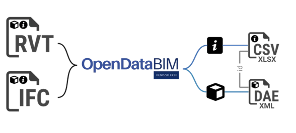 Cloud exporter of BIM data from Revit and IFC outputs DAE (geometry) and CSV (parameters). API for SaaS integration + on-premise version for local processing.