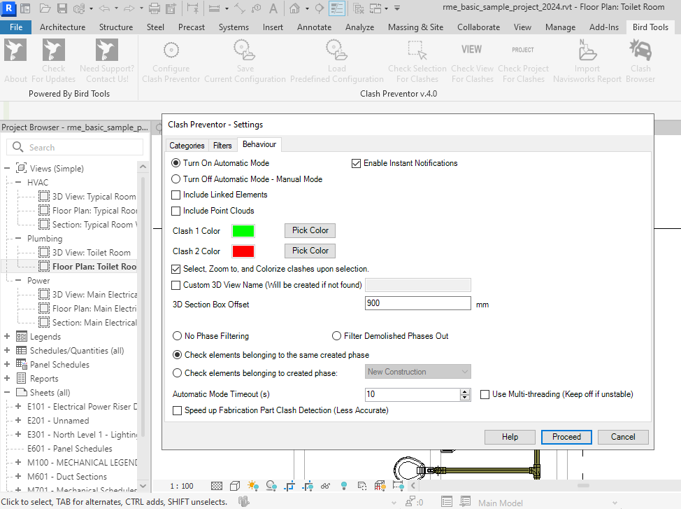 The tool automatically tests modified elements for clashes. A manual mode also exists allowing the user to check selected elements, visible in view elements, or all elements for clashes as well.