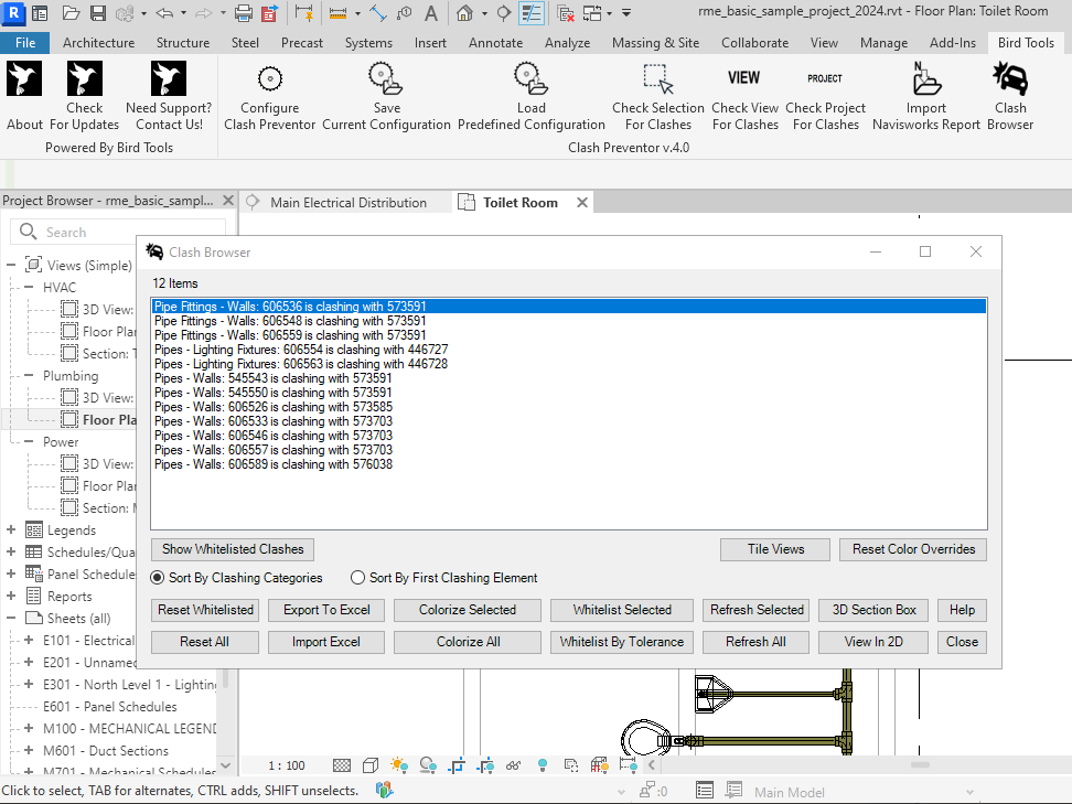 When clashing elements are detected, the user is allowed to navigate and visualize clashes in 3D by automatically creating a section box around the elements, and has the ability to tile all open views when he proceeds to solve the clashes for a better visualization. The built-in Clash Browser automatically generates a Clash Report that simplifies the clash resolution process, and that can be exported to an Excel spreadsheet, which can be also imported later on.