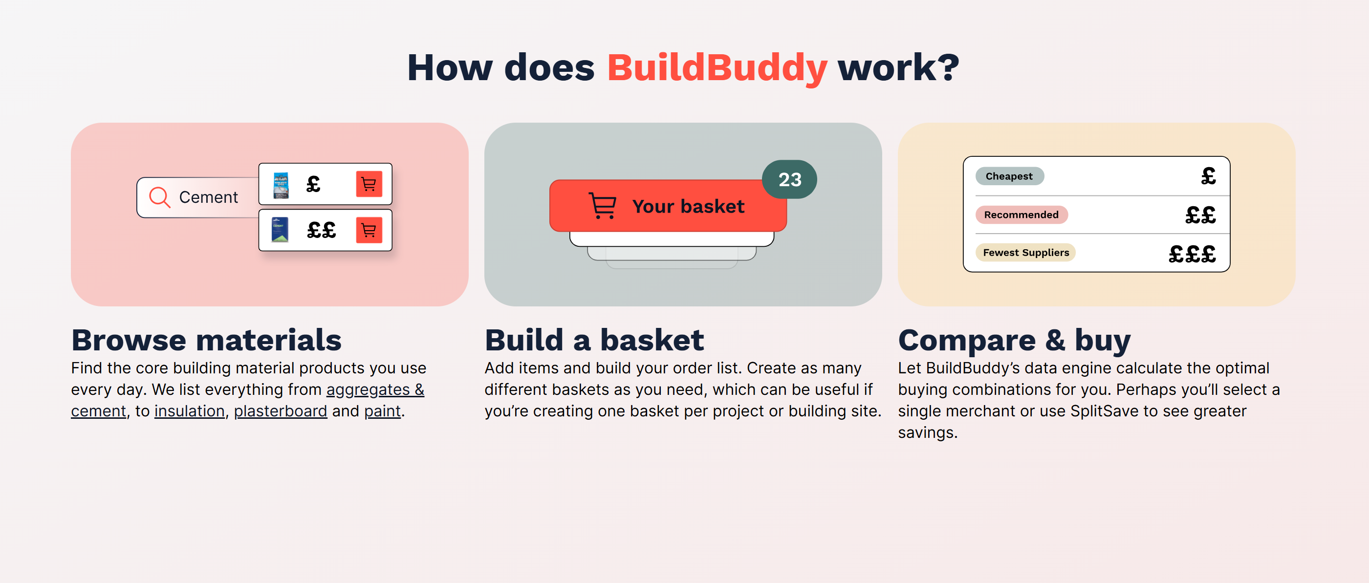 Add items and build your order list. Create as many different baskets as you need, which can be useful if you’re creating one basket per project or building site.