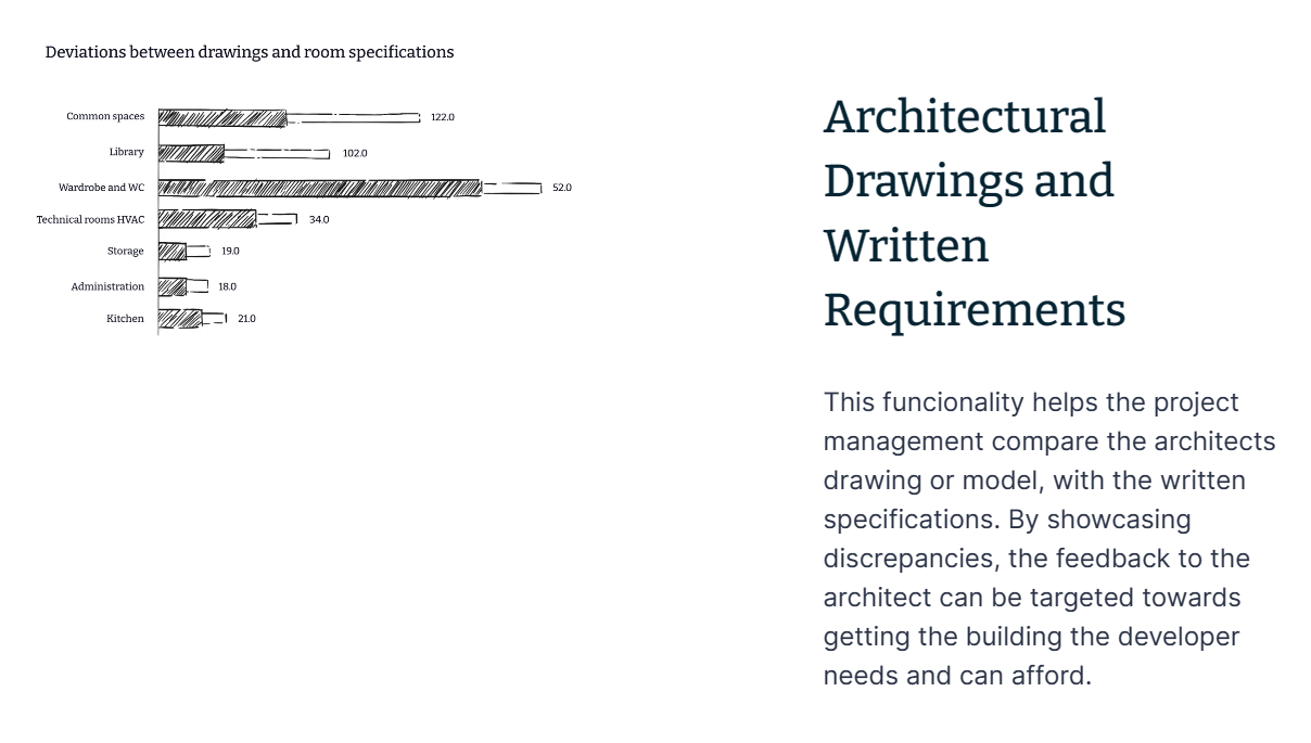 This functionality helps the project management compare the architects drawing or model, with the written specifications. By showcasing discrepancies, the feedback to the architect can be targeted towards getting the building the developer needs and can afford.