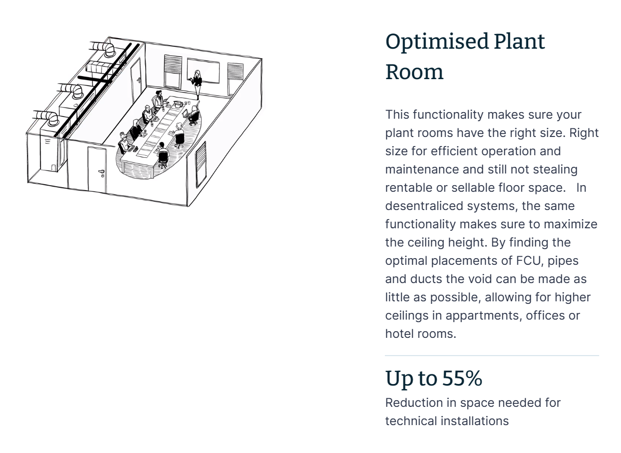 This functionality makes sure your plant rooms have the right size. Right size for efficient operation and maintenance and still not stealing rentable or sellable floor space. In decentralised systems, the same functionality makes sure to maximize the ceiling height. By finding the optimal placements of FCU, pipes and ducts the void can be made as little as possible, allowing for higher ceilings in apartments, offices or hotel rooms.