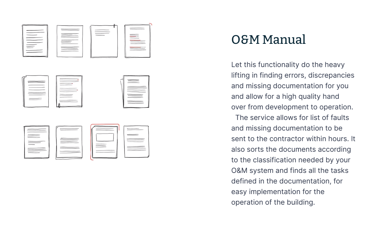 Let this functionality do the heavy lifting in finding errors, discrepancies and missing documentation for you and allow for a high quality hand over from development to operation. The service allows for list of faults and missing documentation to be sent to the contractor within hours. It also sorts the documents according to the classification needed by your O&M system and finds all the tasks defined in the documentation, for easy implementation for the operation of the building.