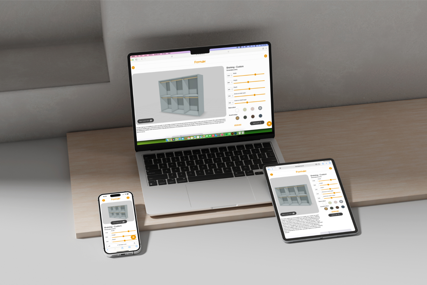 By moving the sliders or typing in your required dimensions in the height, width and depth parameters, you will instantly see the changes to the furniture digital twin in the 3D viewer in real time. The configurator uses a metric system so please note all measurements inserted should be in millimetres. If you want to see the design in your space, you can press the Augmented Reality button and use your device to visualise how the furniture will look. Once the design is finalised, bespoke production CAD and 3D files are automatically sent to digital fabrication labs for manufacturing.Â