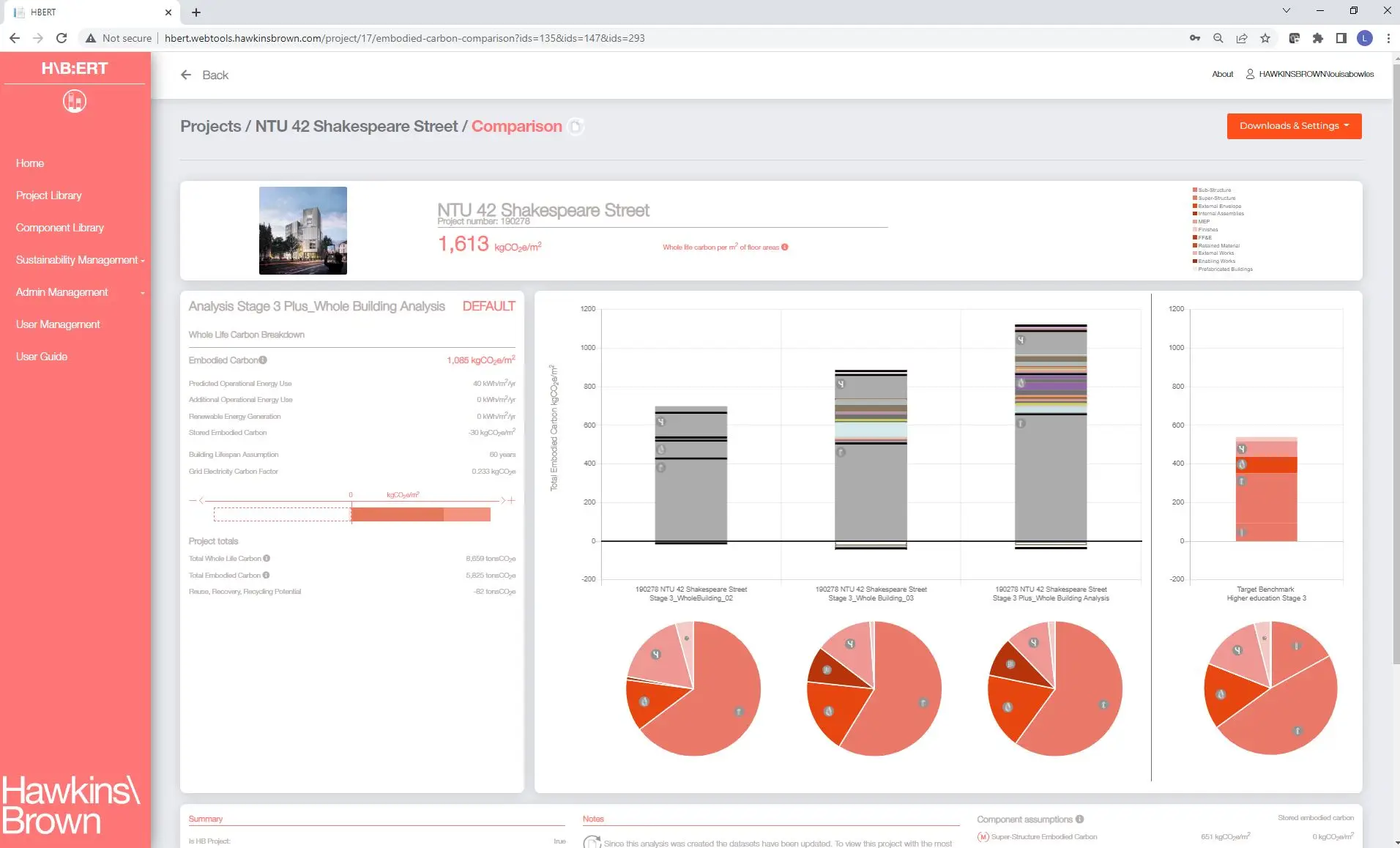 H\B:ERT V2 has evolved from the free version through the creation of a web-based data collection and visualisation platform, that allows the data from Revit to be more clearly represented. The tool enables the filtering of results, comparisons between various design options for both embodied and whole life carbon, as well as a breakdown of building elements and life cycle stages aligned with the RICS Methodology 2017 and GLA WLC reporting. We have also added a component library which allows the quick comparison of different build-ups to drive good decision making from the earliest stages of creating an outline material palette.