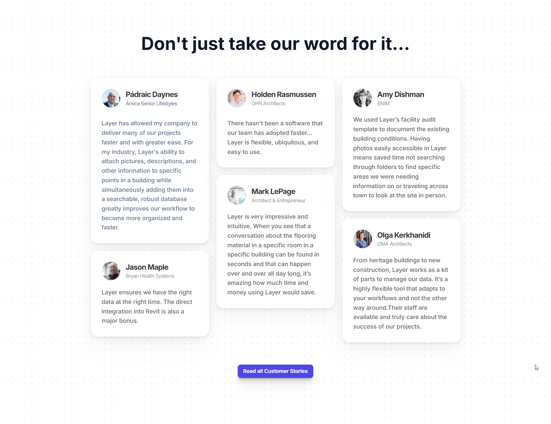 Layer is a workflow platform that connects Field Data, Room Data Sheets, FF&E, Punch Lists and more to Revit and PDF floor plans.