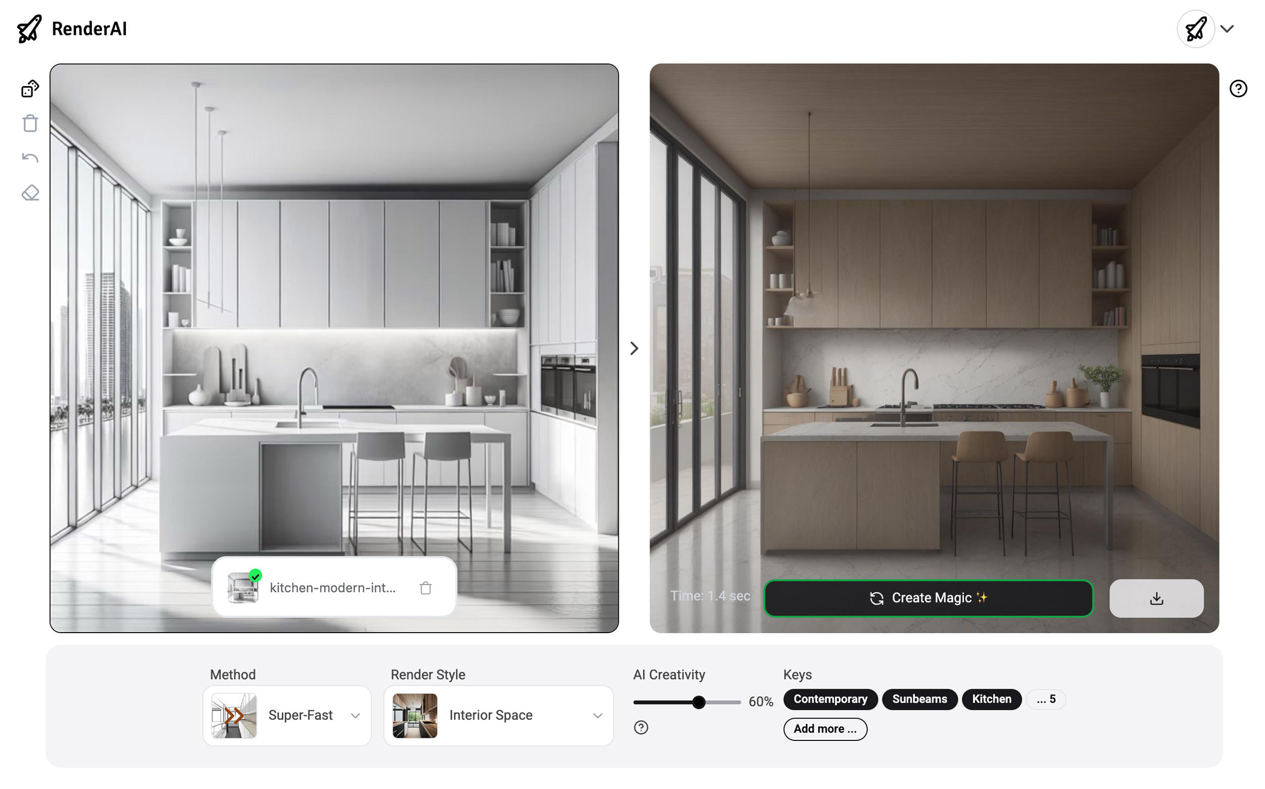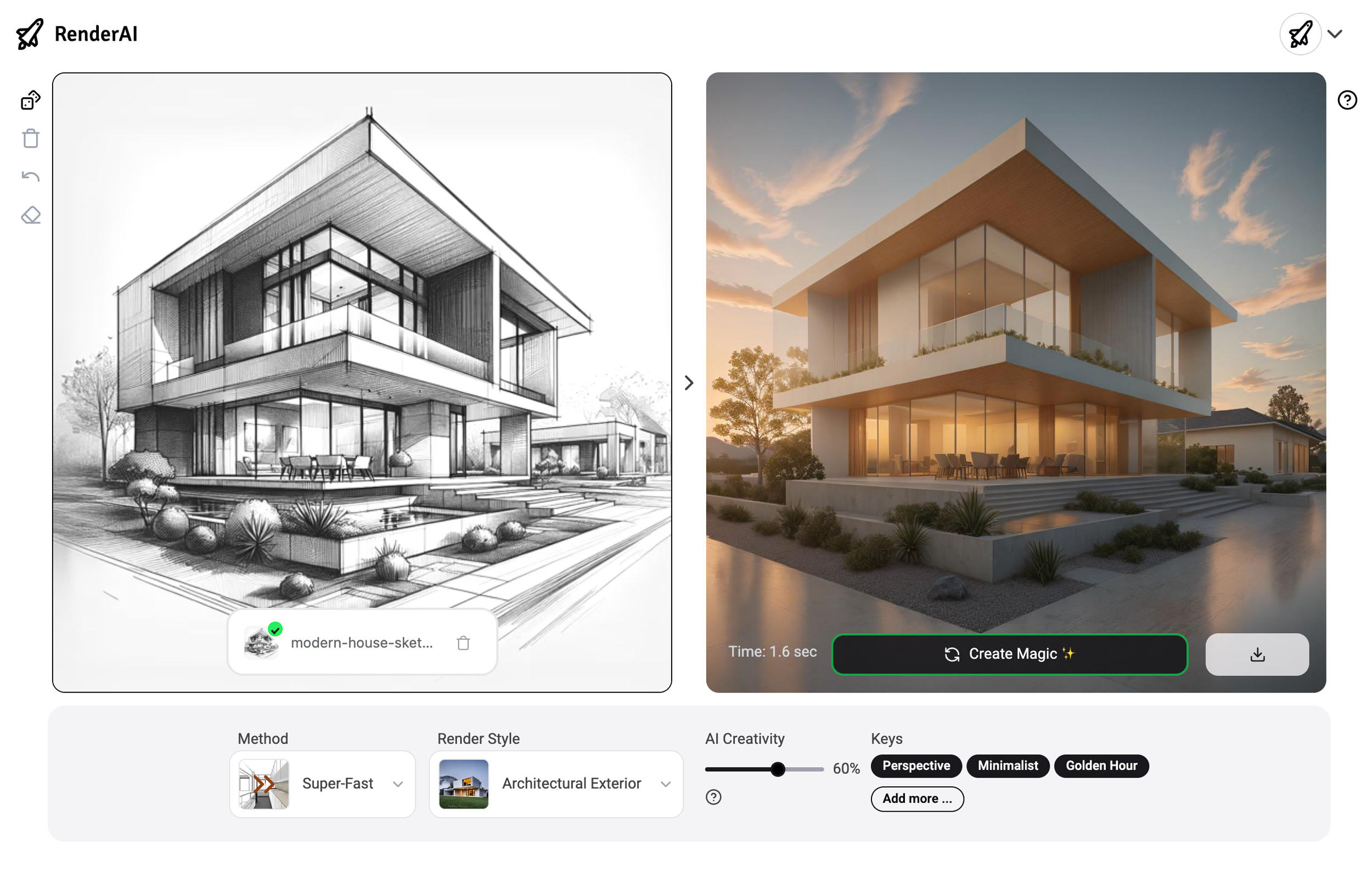 RenderAI is an online design tool that transforms hand-drawn sketches or text prompts into high-quality, photorealistic images and videos in seconds powered by AI. Designed for professionals like architects, interior designers, product creators, and marketers, it streamlines the visualization process—no complex software or steep learning curves required. Users can upload a sketch or start from scratch within the browser, and with a click, generate detailed renderings suitable for presentations, portfolios, or client proposals. The platform also offers features like image upscaling and animation, making it a versatile solution for creative professionals.