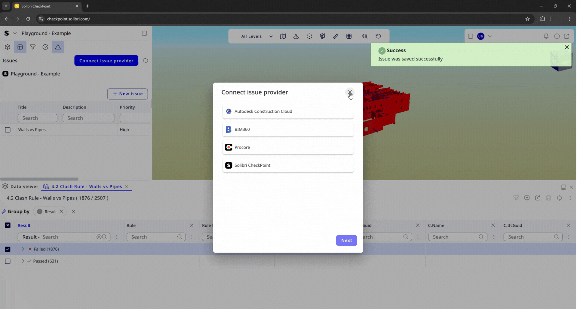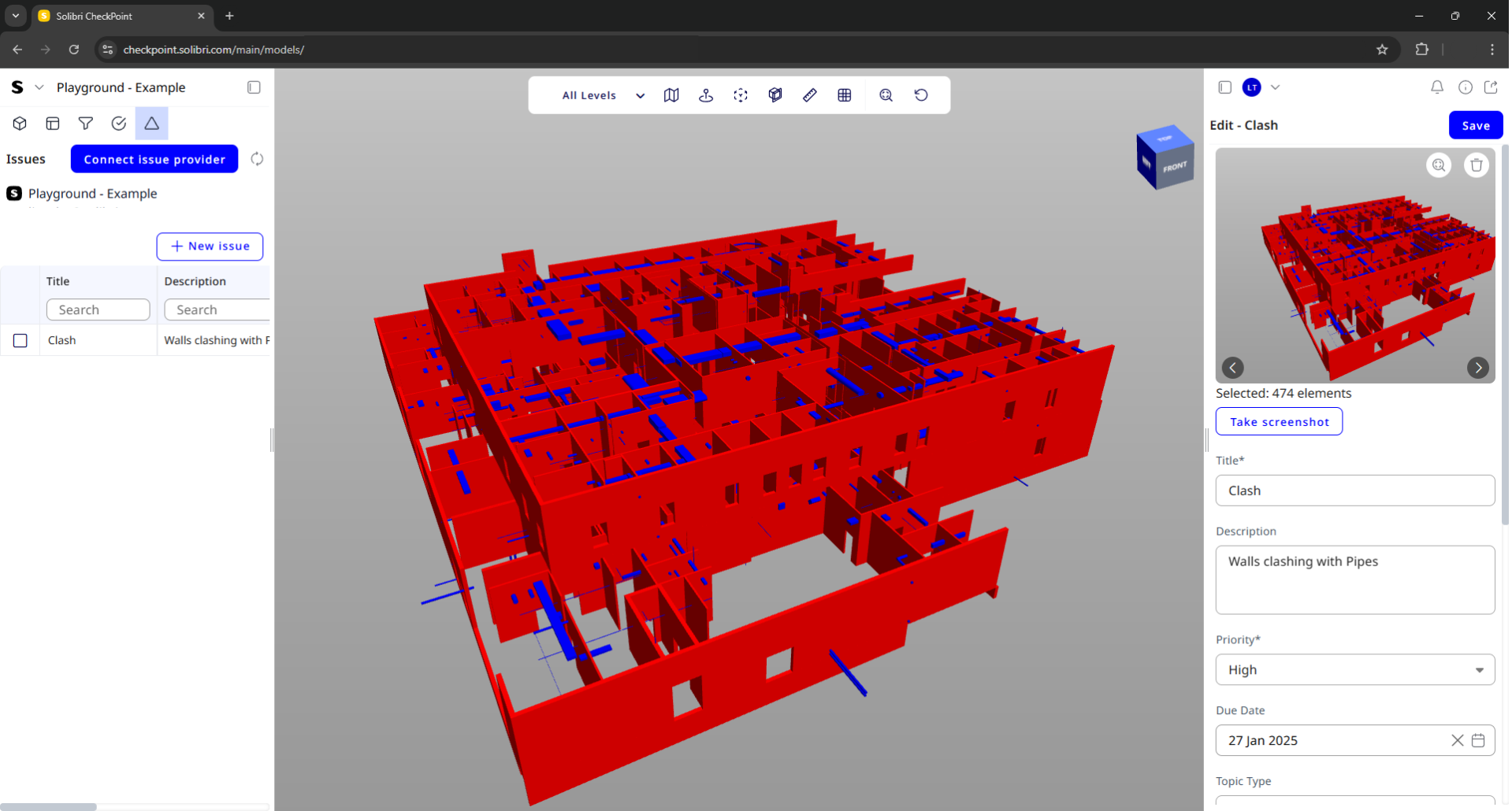 – Effortless issue management: Identify, assign, and track issues directly within the platform. Sync with external issue trackers or export as BCF files. Add priorities, due dates, and screenshots to ensure resolution clarity amongst multidisciplinary construction stakeholders.