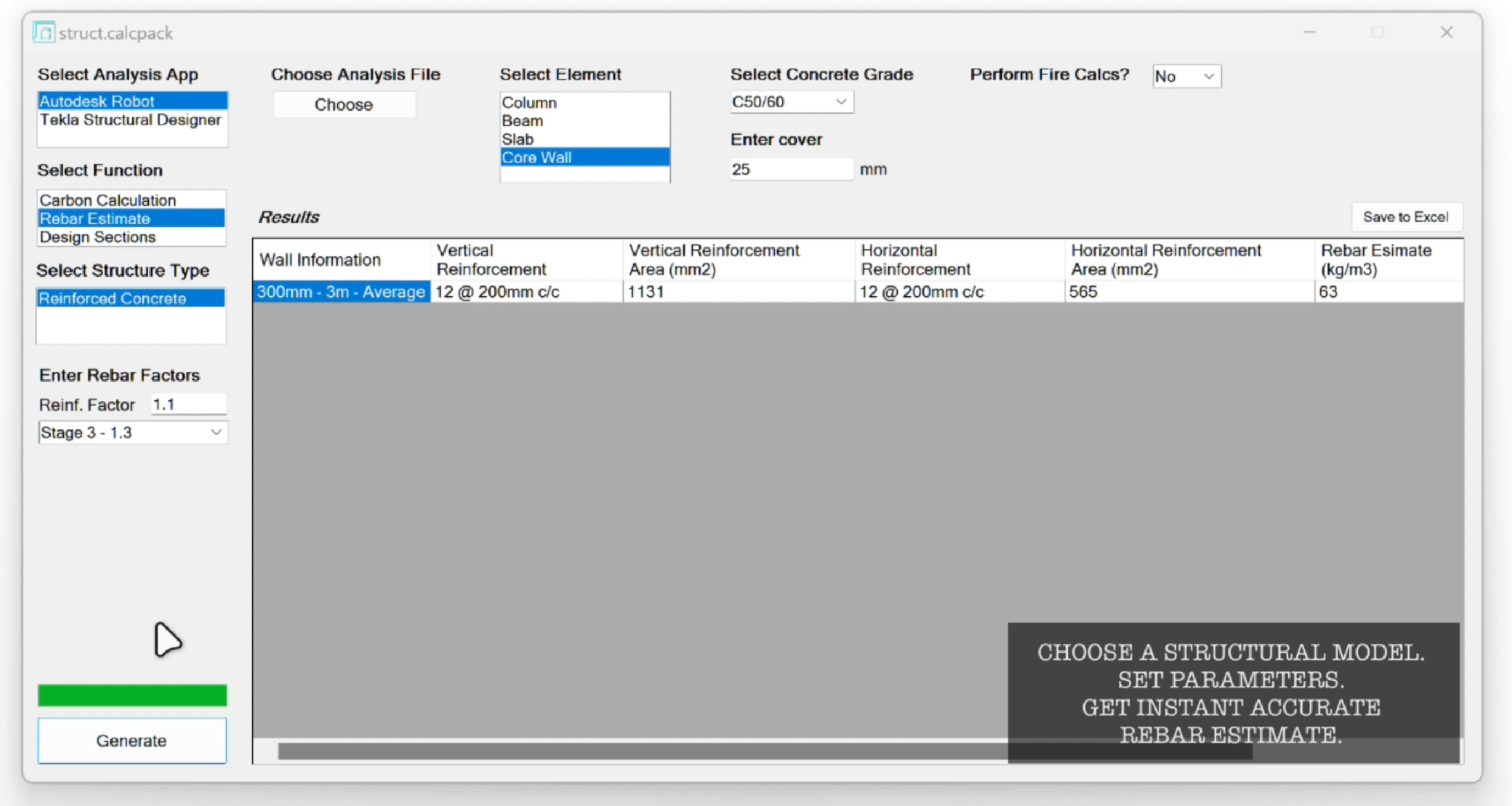 struct.calcpack uses data from an Autodesk Robot model to generate calculation packages using the design power of Tekla Tedds. Set the required variables – concrete/steel grade, fire duration (for columns, beams and walls) and concrete cover and get calculations or rebar estimates or embodied carbon (also compatible with Tekla Structural Designer) with the click of a button.