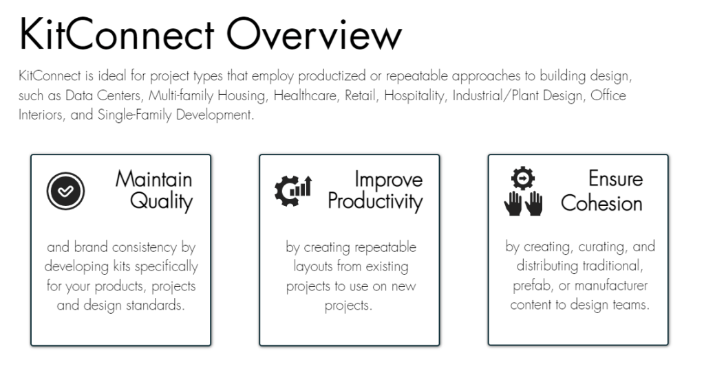 KitConnect is ideal for project types that employ productized or repeatable approaches to building design, such as Data Centers, Multi-family Housing, Healthcare, Retail, Hospitality, Industrial/Plant Design, Office Interiors, and Single-Family Development.